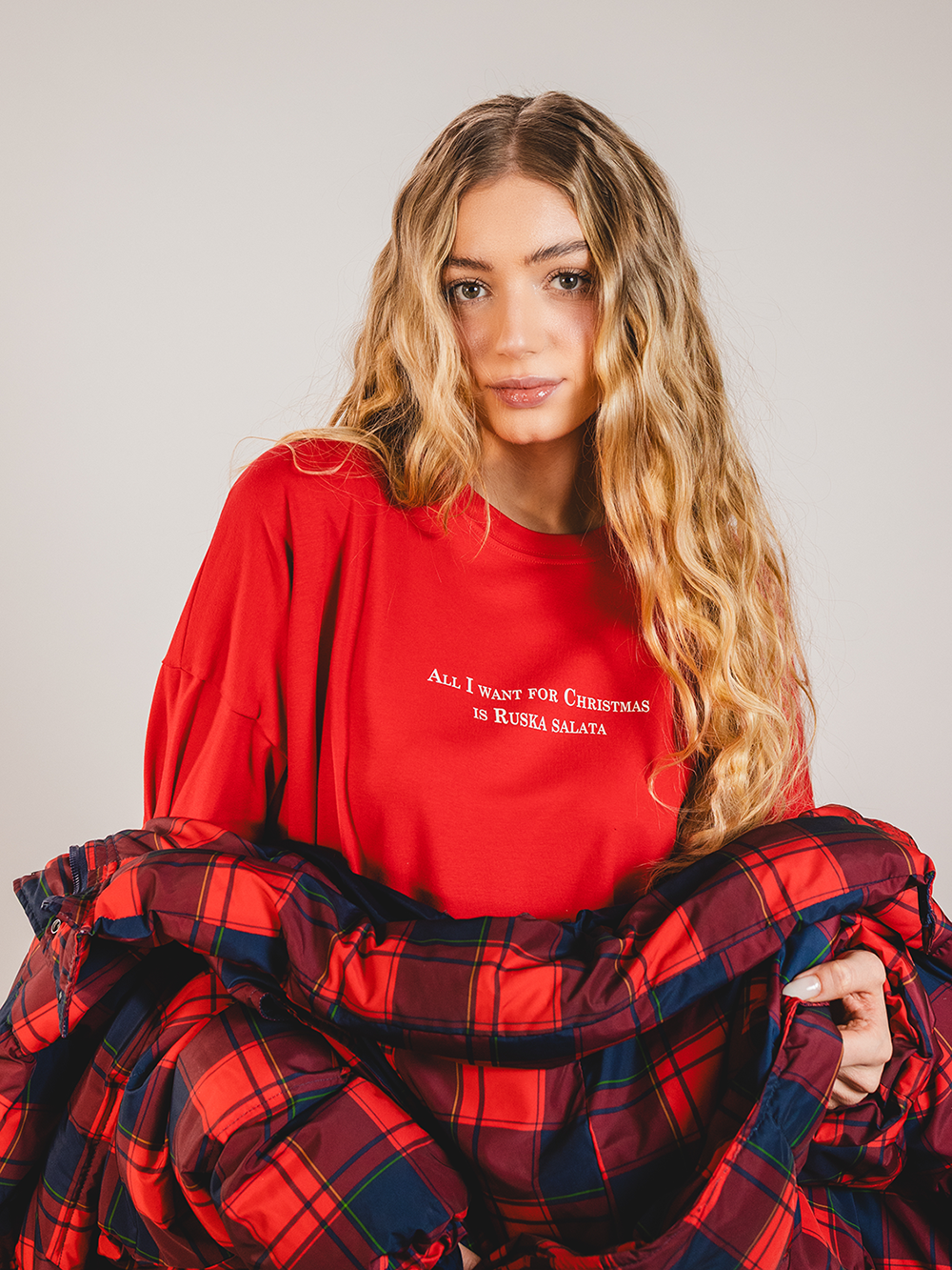 Oversize ženska majica “All I want for Christmas is ruska salata” unosi humor i tradiciju u tvoj praznični stil.