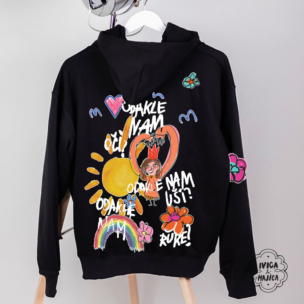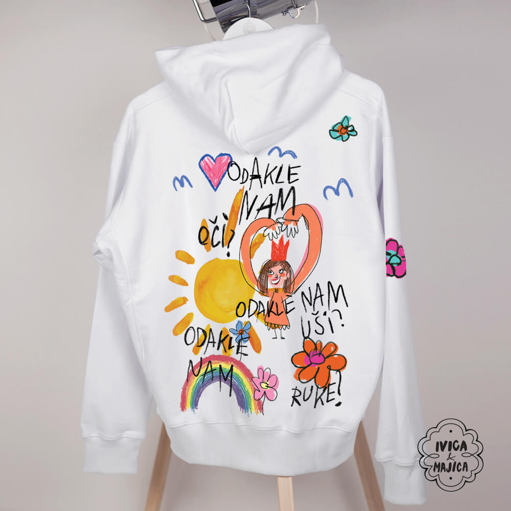 Ženski modeli se rade u veličinama od S do 2XL, osim oversize modela i crop topa koji se radi u jednoj univerzalnoj veličini. Muške modele izrađujemo u veličinama od S do 3XL. Dečiji bodići se rade u veličinama 62, 68, 74, 80, 86, 92, a dečije majice kratkih rukava i duksevi u veličinama 1, 2, 4, 6, 8, 10, 12, 14 (brojevi označavaju uzrast deteta).